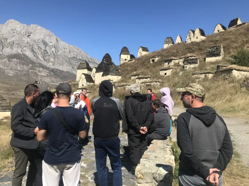Сегодня утром выезжаем в Северную Осетию — вас ждёт экскурсия по значимым и памятным местам республики. Сначала побываем в даргавском некрополе — «Городе мёртвых». Вы посмотрите на сохранившиеся здесь традиционные башни-склепы, которые часто можно увидеть на фотографиях Осетии. Удивительное открытие — найденные в некоторых гробницах мумии в гробах-лодках, сделанных из цельных кусков ствола. Учёные до сих пытаются разгадать секрет этой необычной находки.