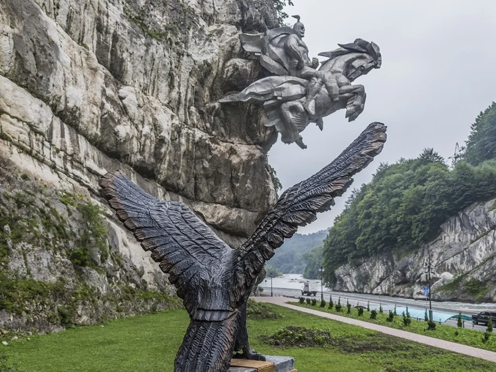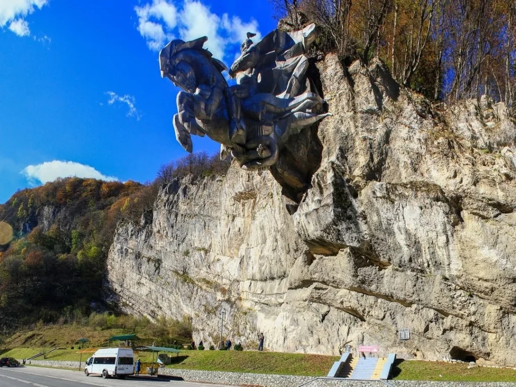 Позавтракаем и в 08:30 отправимся к памятнику Уастырджи — одному из наиболее почитаемых небожителей осетинского пантеона. Размеры монумента поражают: в камне запечатлён богатырь верхом на коне, на одной лишь руке которого мог бы уместиться человек.