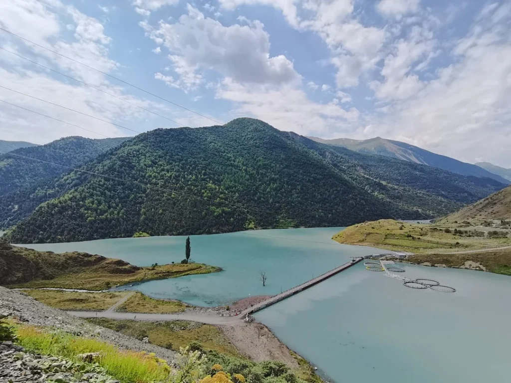 Со смотровой площадки водохранилищам Зарамагской ГЭС сделаем эффектные снимки. Только представьте: бирюзовый водоём, над которым возвышаются поросшие лесом вершины!